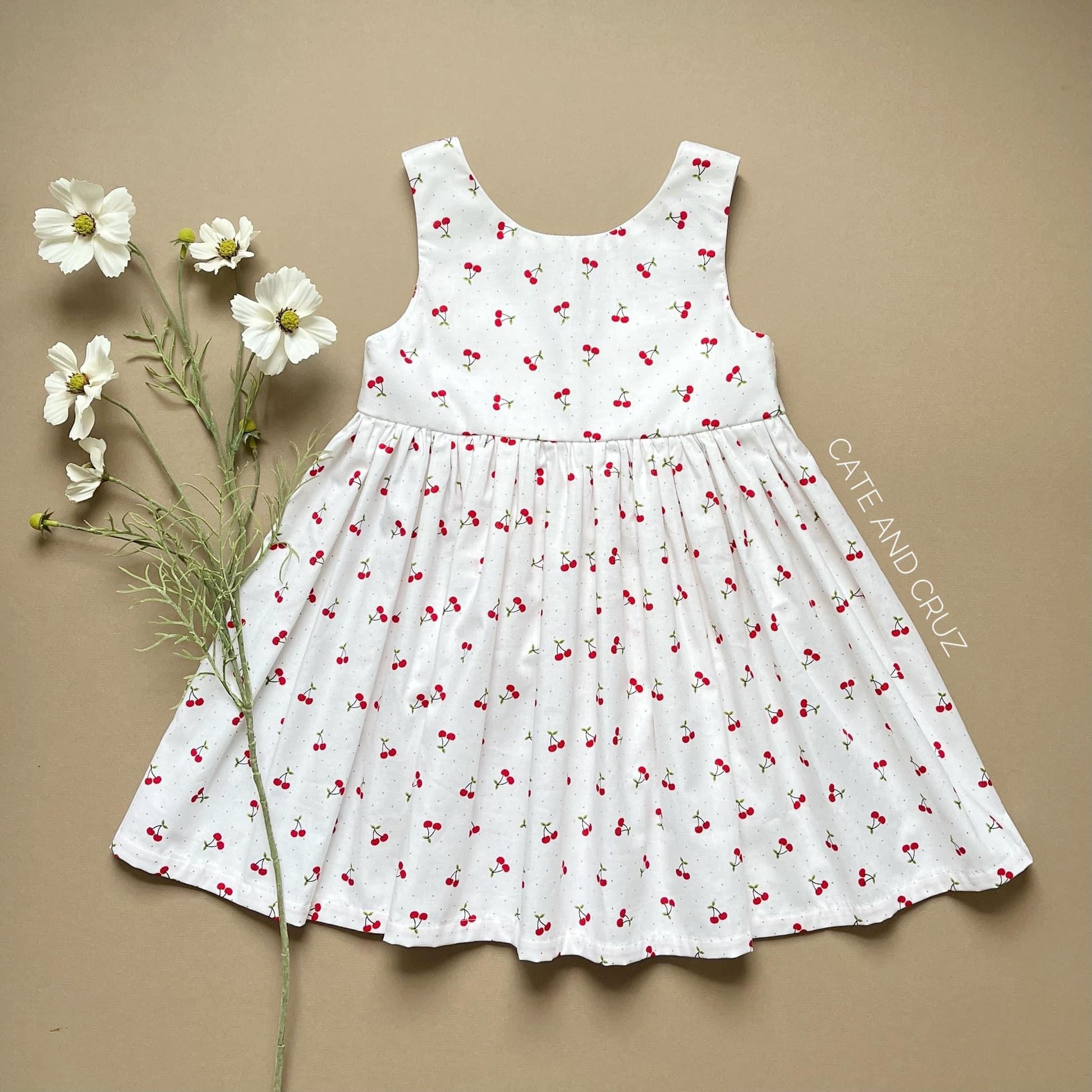 A favorite silhouette of ours, this dress features a deep V back with button closure. The dainty cherry print is so sweet (pun intended 😉), and makes for a perfect summer dress. Add a blue bow or denim jacket for an instant 4th of July outfit! 100% cotton.